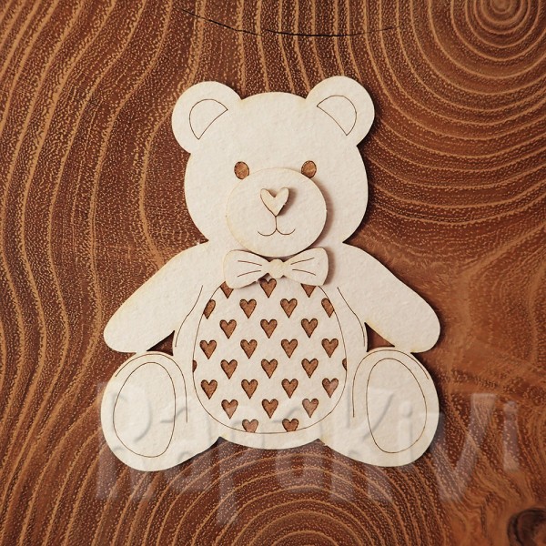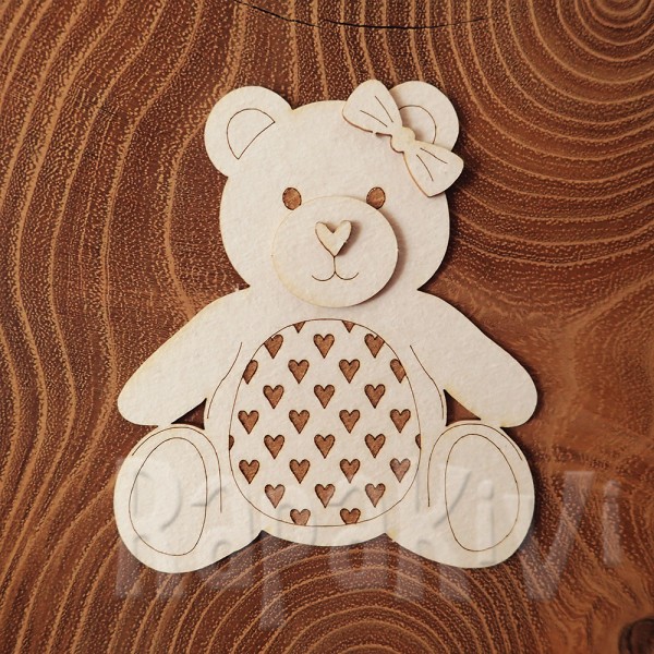 Uroczy wycinany laserowo miś - warstwowa tekturka, którą można skleić na dwa sposoby: w zależności od tego, gdzie umieścimy kokardkę miś może być dziewczynką lub chłopcem ;) Wymiary tekturki to 63 x 72 mm.