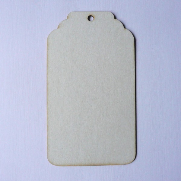 Duży tag o wymiarach 14 cm x 8 cm. Wycięty laserowo z białej tektury o grubości 1 mm.