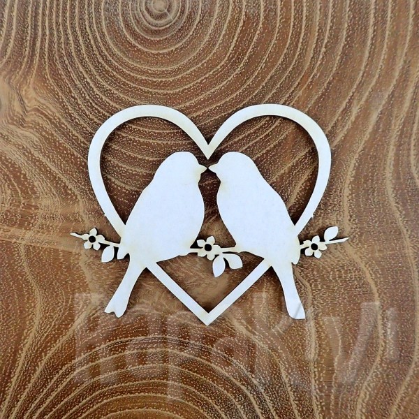Wycinany laserowo element z tektury introligatorskiej - ptaszki w serduszku. Wielkość tekturki to 4,8 x 6,1 cm. Tekturkę należy delikatnie naciąć nożykiem w miejscach łączenia z arkuszem lub wypchnąć palcami.